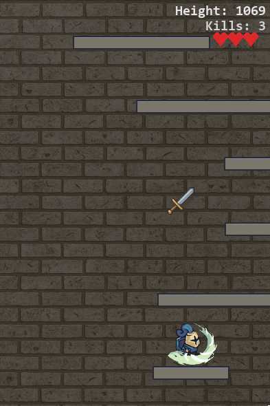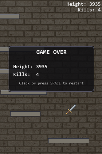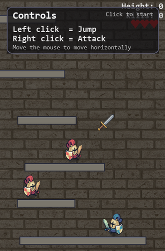 Hey, nice game. Unique mechanics, just using the mouse for controls. A couple of suggestions, maybe a quick slash screen to show controls, and don't let the player run towards the mouse if the mouse not over the game. A quick game over overlay to show what the height was, maybe something to show how many enemies you killed. The game resets too fast and I have no idea what my highest score is. I thought my best was 32054 then realized after a few games, I was luck to get 10000... lol. My character was also able to walk backward if I moved the mouse slowly behind my character. Really fun game though.